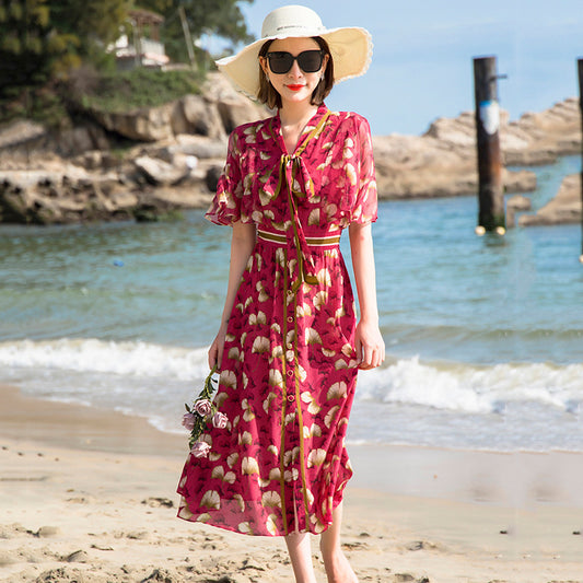 Silk Dress Bohemian V-neck Elastic Waist Color