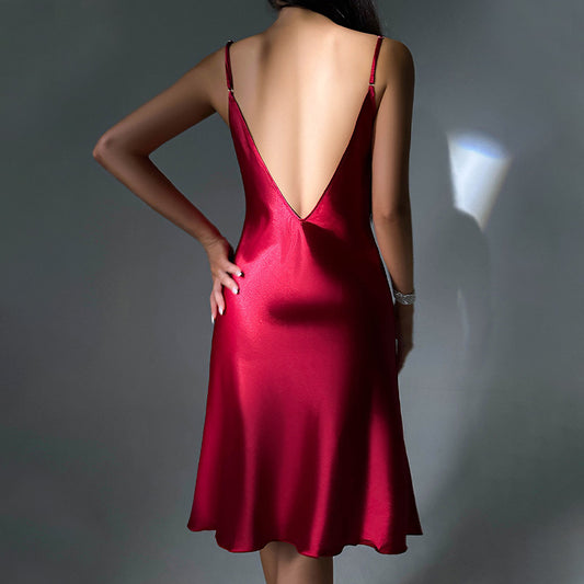 Sexy Slit Suspender Skirt Mid-length Silk Nightdress Artificial Silk Home Backless Suspender Pajamas
