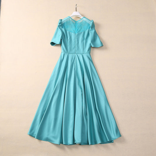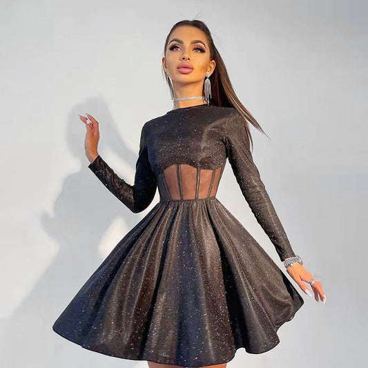 Round Neck Bright Silk Big Swing Dress Sexy Perspective Stitching