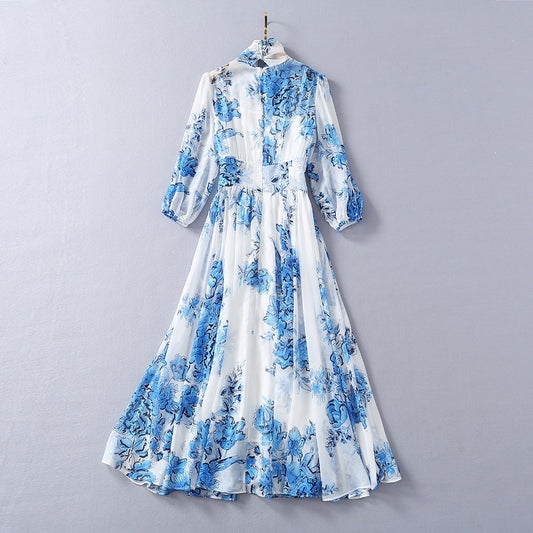 Silk Collar Blue And White Porcelain Printed Chiffon Fashion Dress