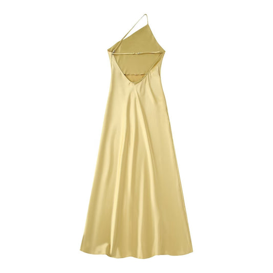 One Shoulder Asymmetric Silk Satin Texture Waist Pulling Dress