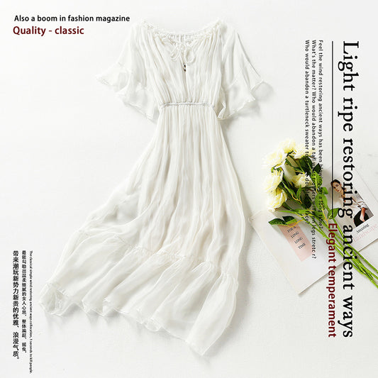 Lace-up Stitching Solid Color Short-sleeved Silk Dress