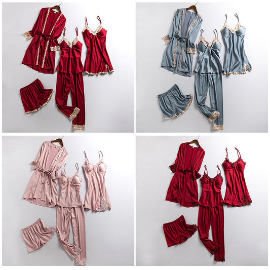 Ice Silk Thin Sling Nightdress Nightgown Five-piece Home Service