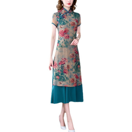 Chinese Style Graceful And Fashionable Slim-fit Silk-like Cheongsam Dress