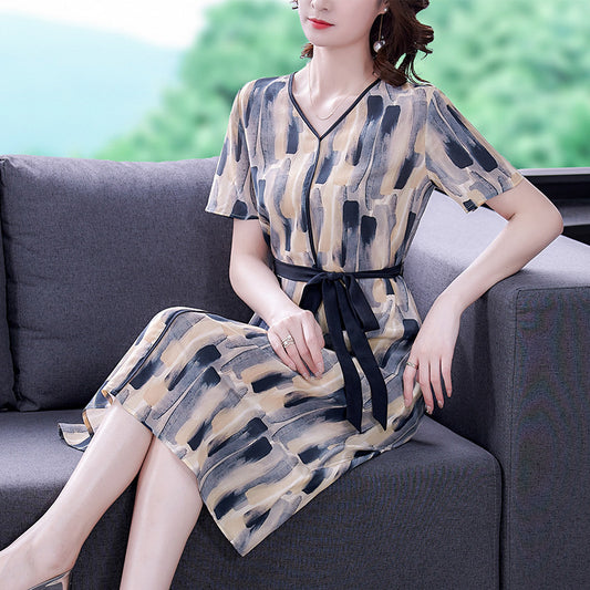 Women's Loose Round Neck Ice Silk Printed Large Swing Dress