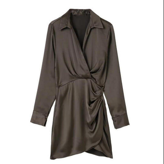 Women's Lapel Silk Satin Long Sleeve Short Dress