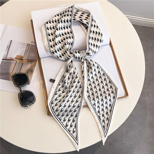Thin Narrow Long Shirt Scarf Houndstooth Design Double Layer Imitated Silk Scarves Women's Hair Tie
