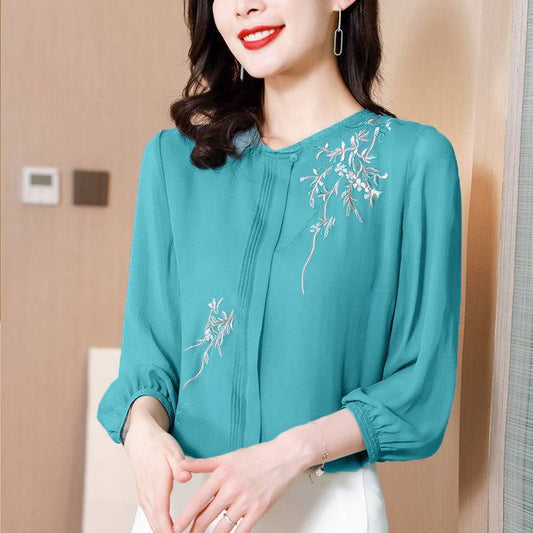 Women's Long-sleeve Satin Silk Top With Embroidered Shirt