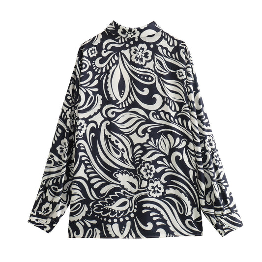 Silk Blouse Women Fake Bow-knot Printing Blouse Satin Silk Long-sleeved Shirt