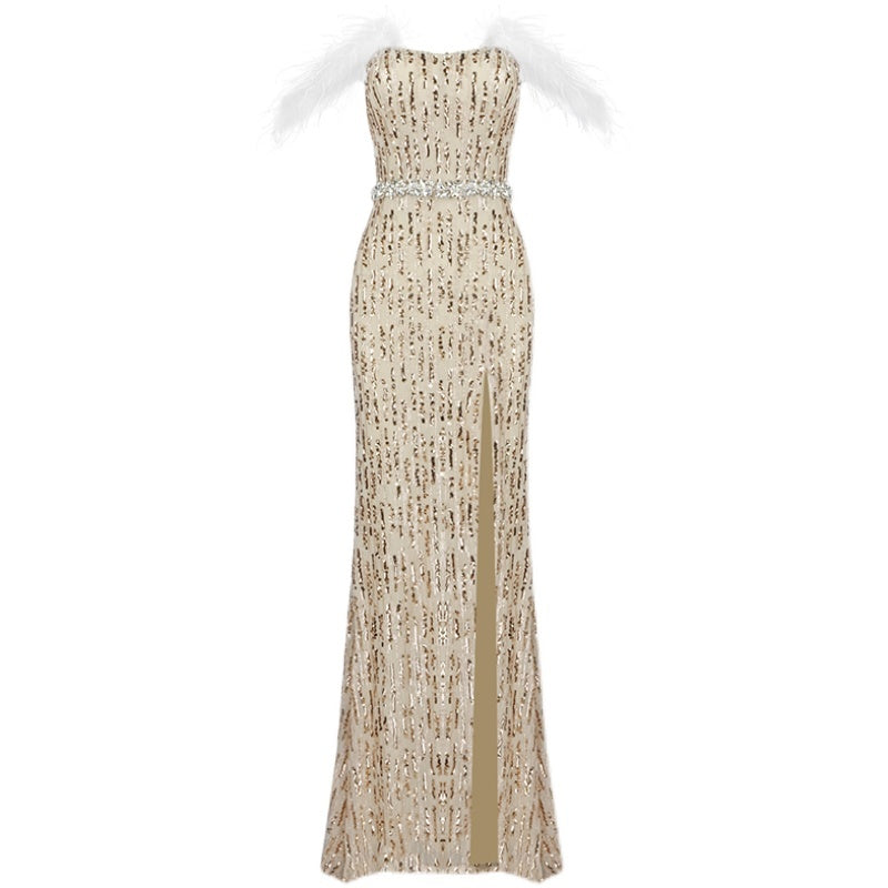 The body of the dress is sculpted to perfection in stretch satin or liquid velvet, cinching at the waist and hips to emphasize every curve. The high thigh slit adds undeniable sensuality, offering a glimpse of leg and elongating the form as the gown flows into a dramatic fishtail train that pools at your feet like molten midnight.