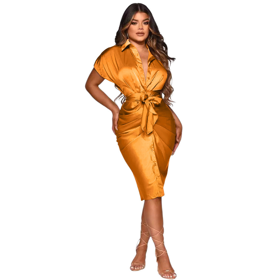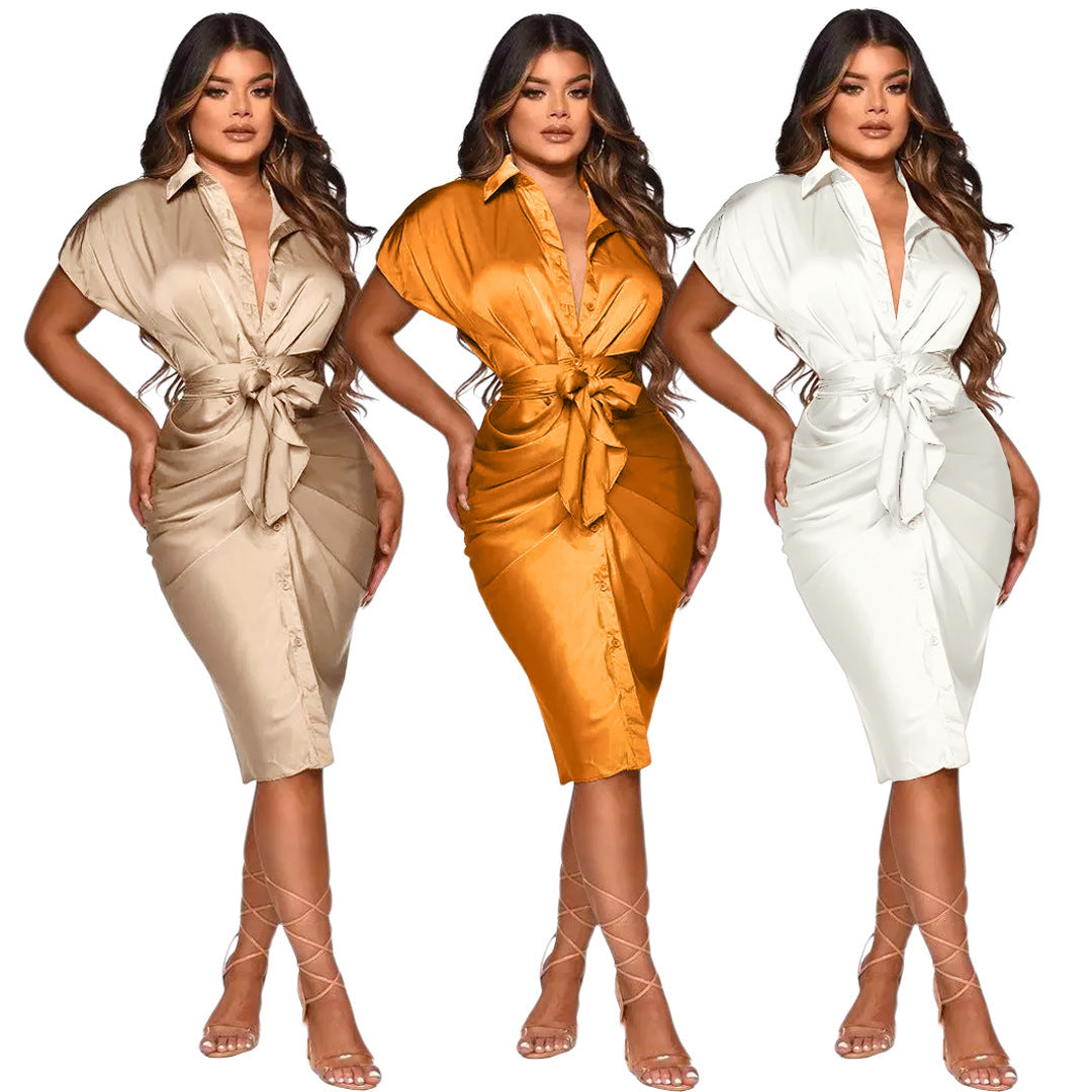 Reflective Silk Pleated Tie Shirt Dress