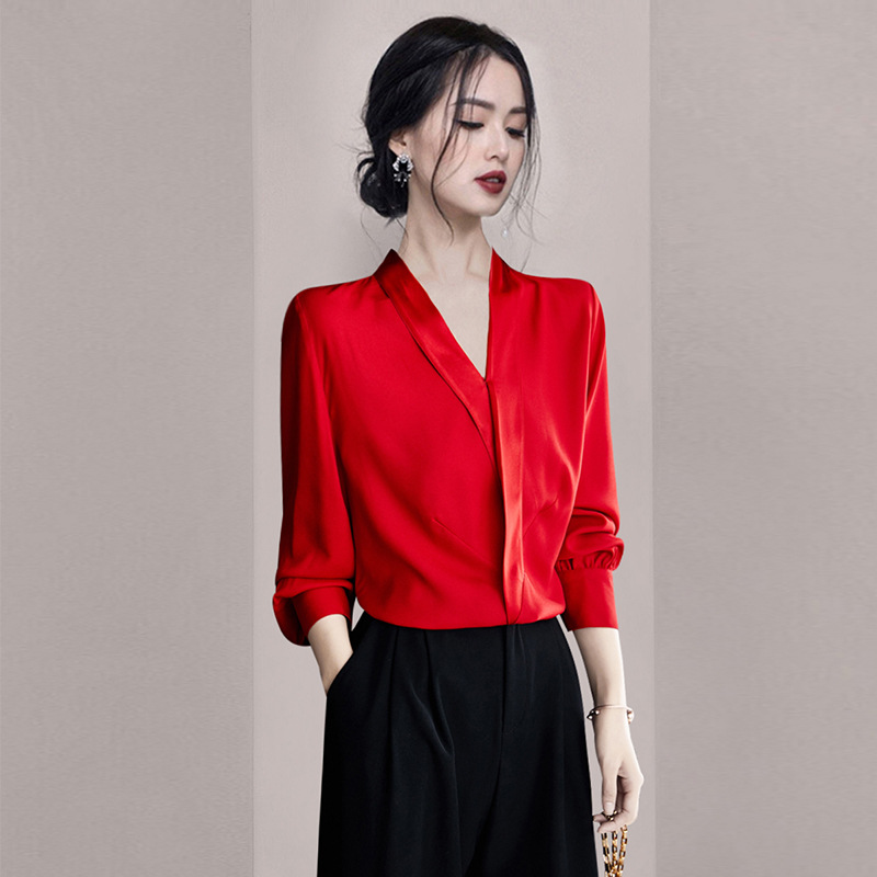 Satin Red V-neck Silk Shirt And...