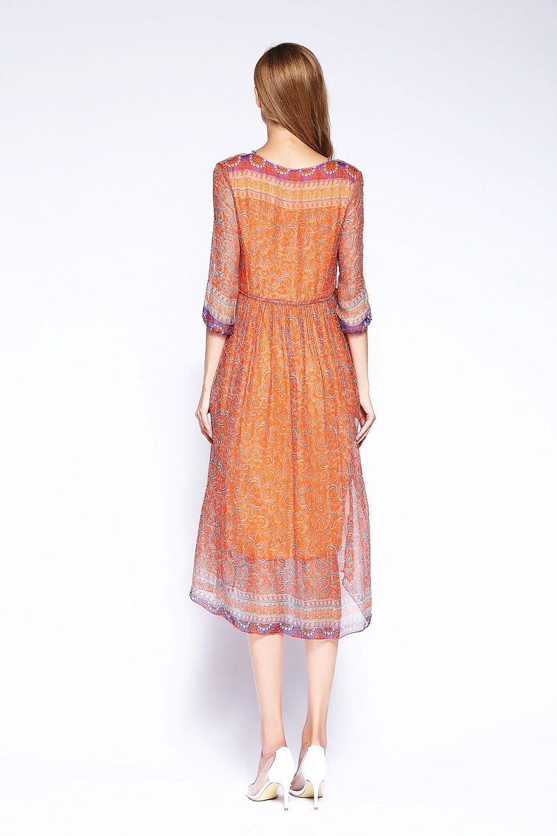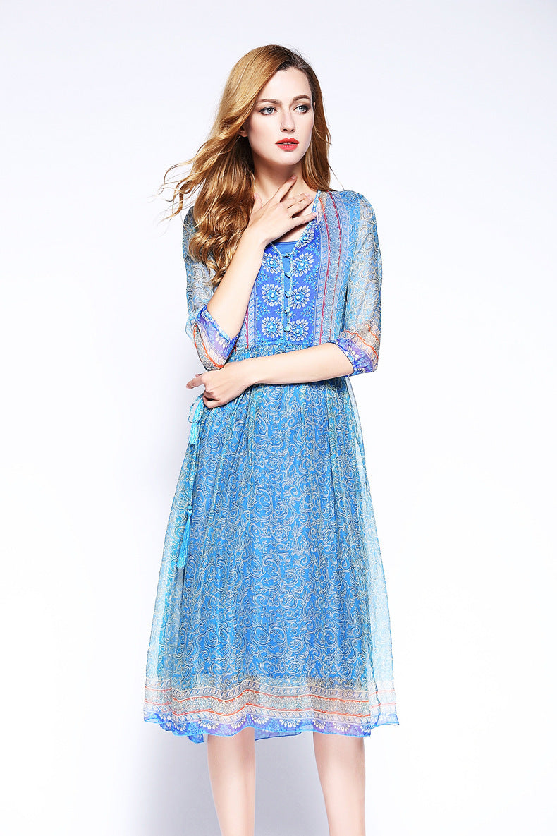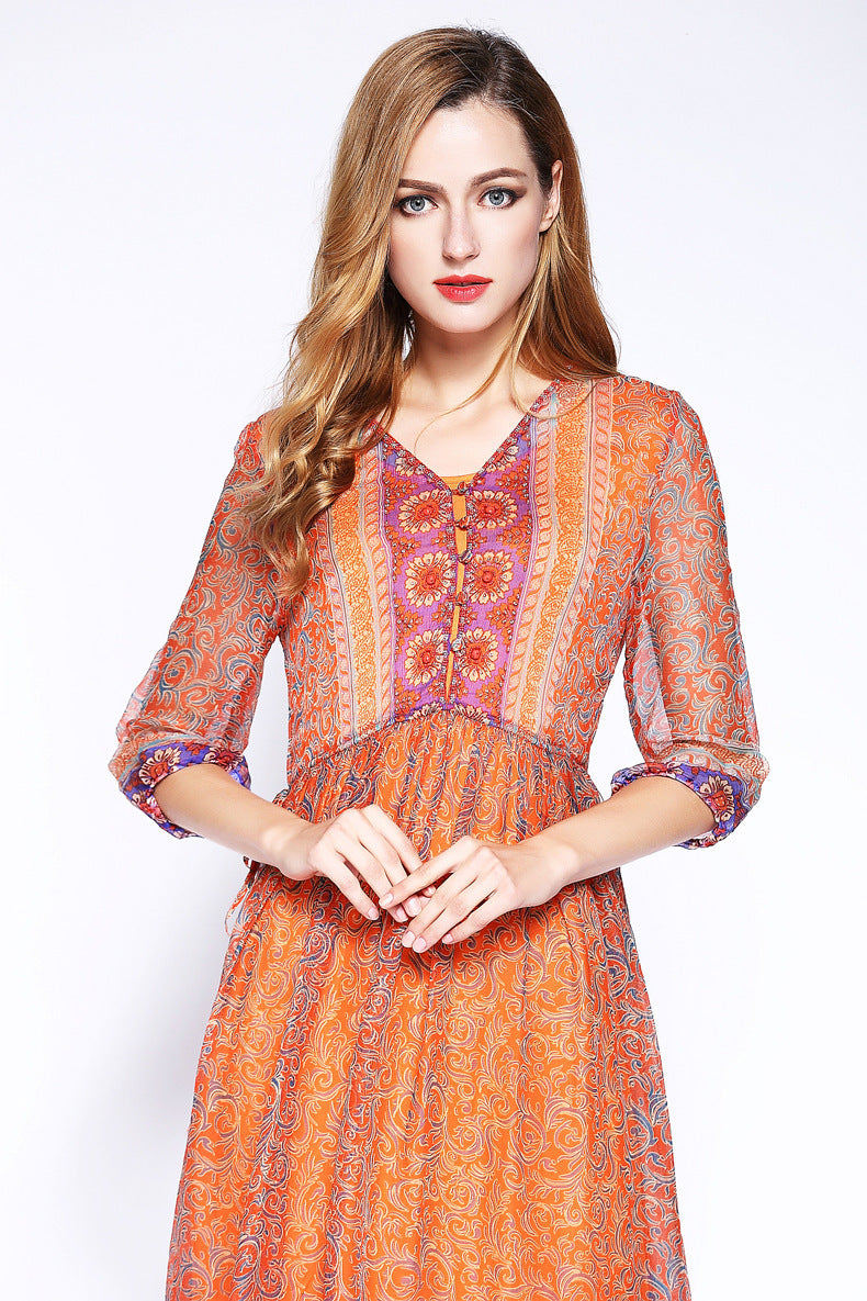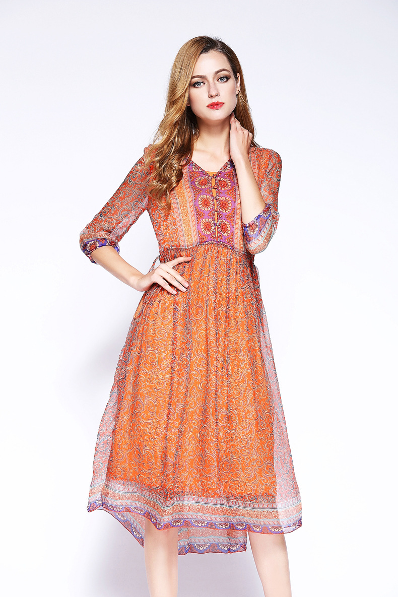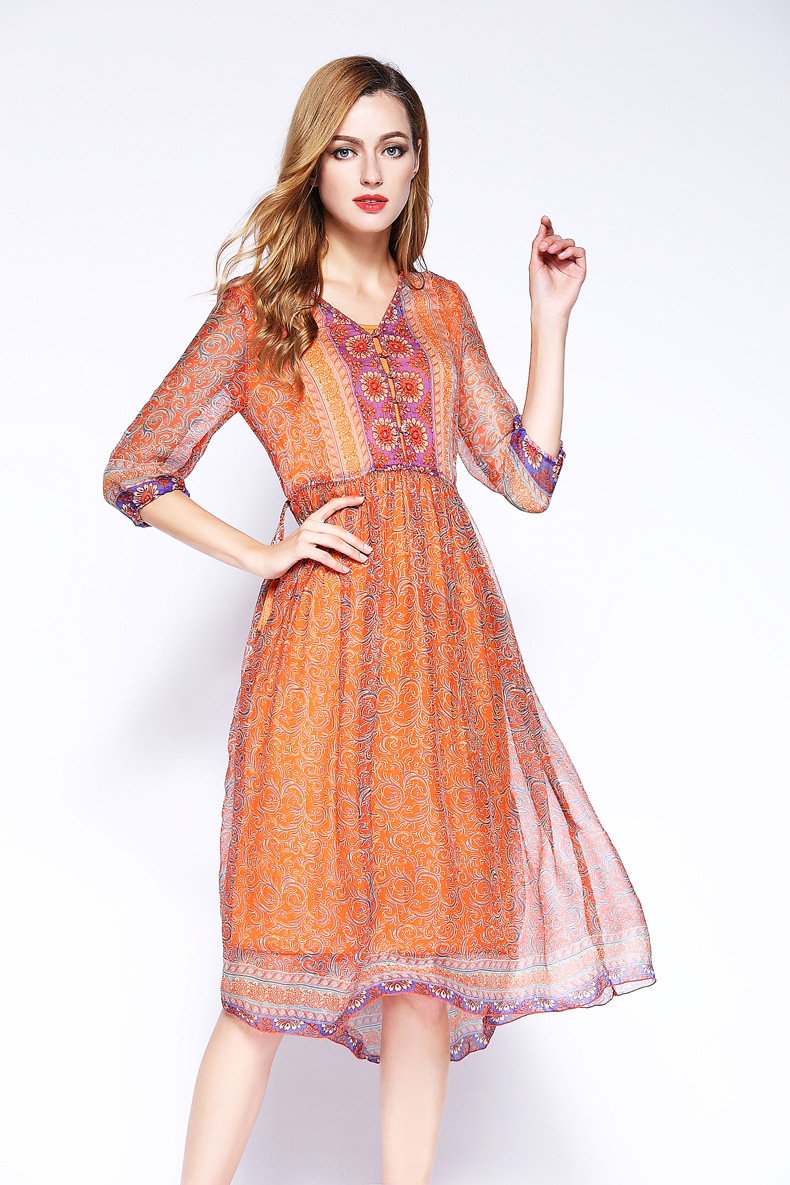 Silk Dress Mid-length V-neck Bohemian Floral...