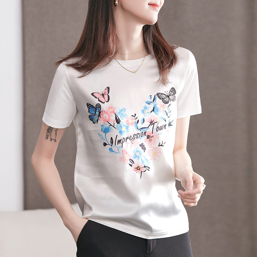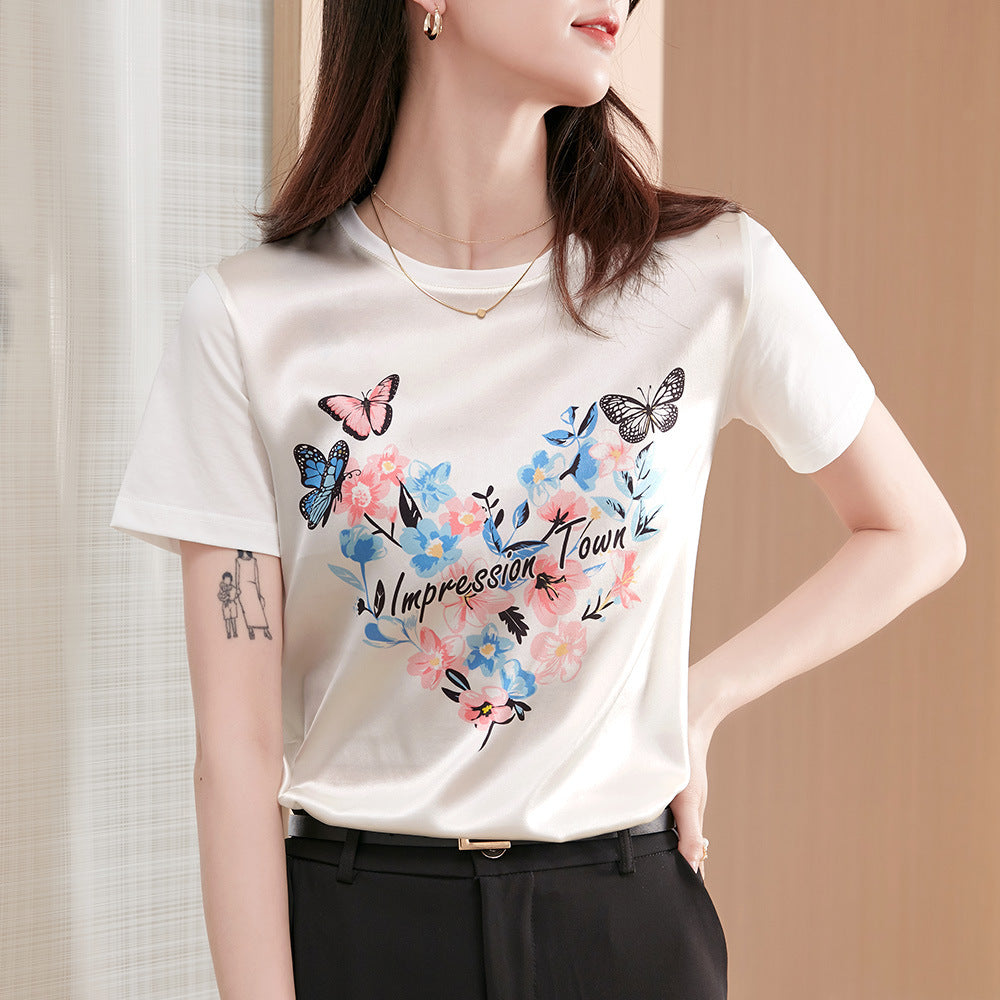 Silk T-shirt Women Short-sleeved Butterfly Love...