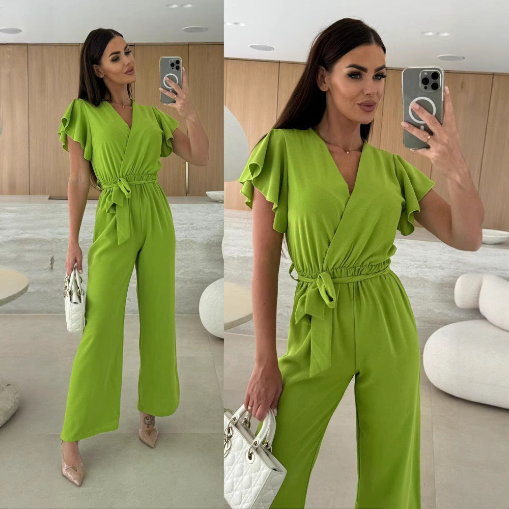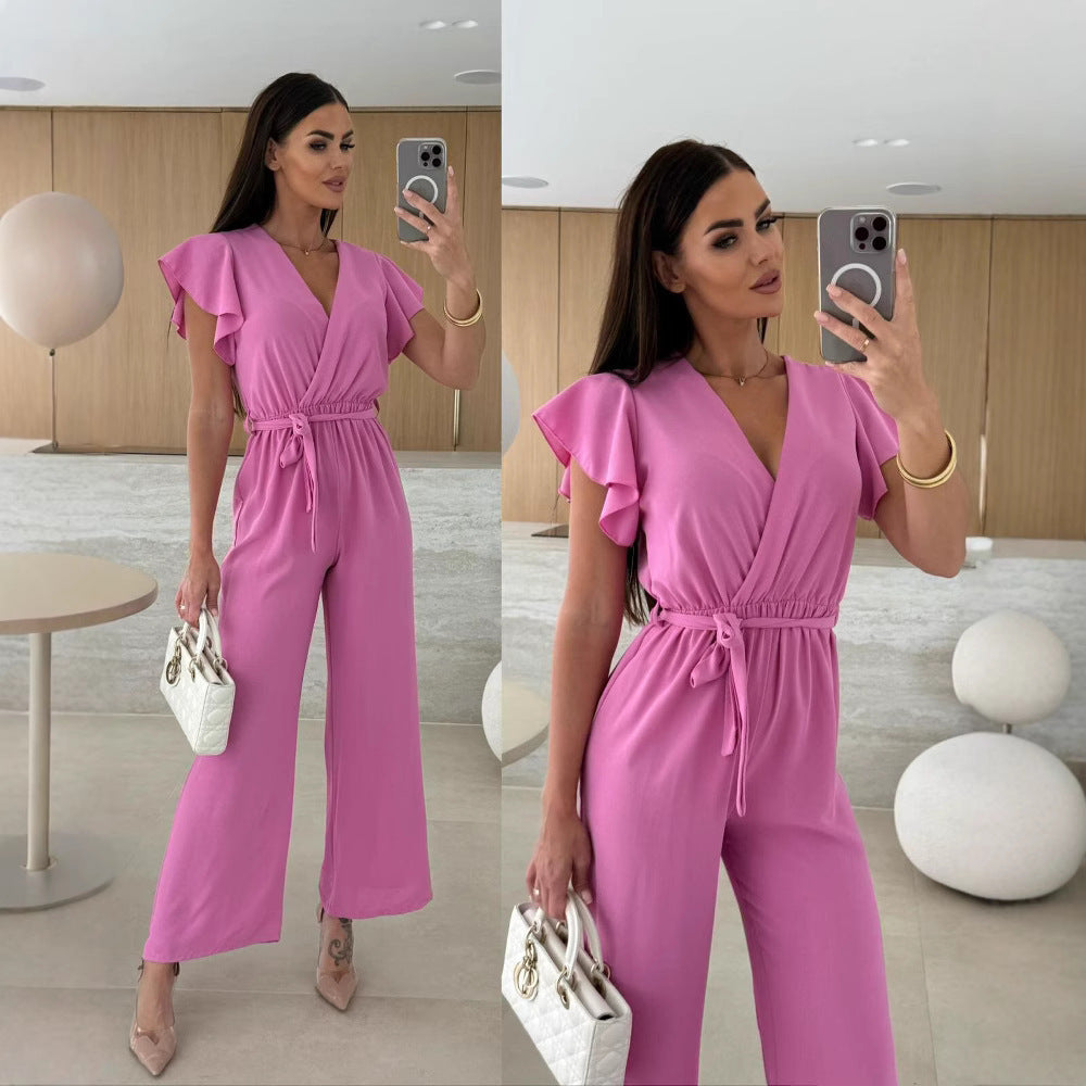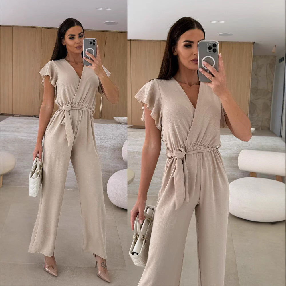 V-neck Lace-up Nipped Waist Trousers Jumpsuit